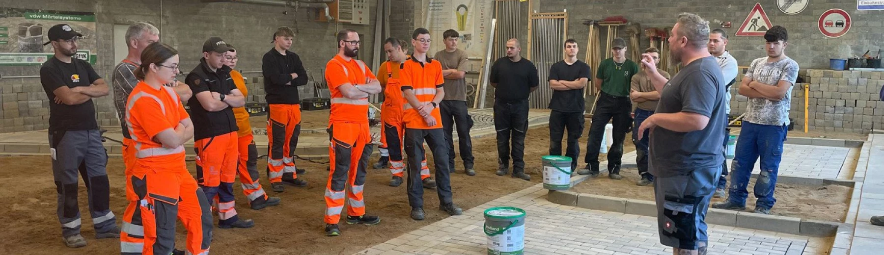 23 Auszubildende des zweiten Lehrjahres aus den Gewerken Straßenbau, Kanalbau sowie Straßenwärter / Straßenwärterinnen kamen zum Workshop im BZB Krefeld zusammen, um an fünf Stationen die Vorzüge und Besonderheiten verschiedener Pflasterfugenmörtel kennenzulernen und diese selbst auszuprobieren.